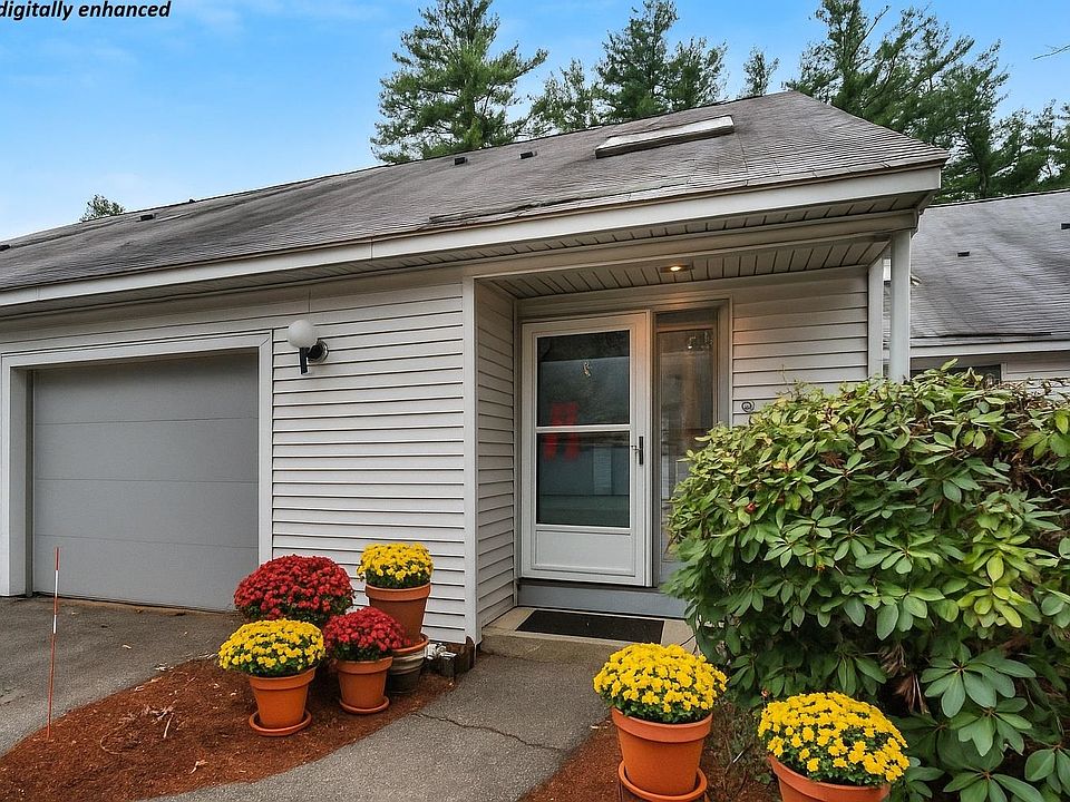 REFRESHED, REFINED AND READY! BETTER THAN NEW TOWNHOME IN A MOST CONVENIENT LOCATION! Minutes from the highway with easy access to Nashua, Manchester and the state border, this thoughtfully updated condominium in a 55+ community blends comfort, style and ease of living. Arrive through the garage protected from the elements or welcome visitors into a soaring foyer illuminated by skylight. Freshly painted neutral hues set a polished and modern tone while the open layout creates a sense of spaciousness. Entertain in a living room that is bathed in natural light from large sliding doors. Conversation will flow to the showstopping kitchen boasting new cabinetry, counters and chic lighting. Grab morning coffee and settle in at the dining table to puzzle over Wordle as you take in backyard views. In warmer months the large deck with automatic SunSetter awning beckons and will become your favorite outdoor room offering shaded relaxation overlooking impeccably maintained grounds. Retreat to the lower level for a movie night or get creative in potential hobby space where plentiful closets come in handy. After a day spent exploring shops, parks, and restaurants, retire to the primary bedroom complete with walk-in closet and a bonus attic area that offers substantial storage. Guests will appreciate their own inviting quarters and shared elegant bathroom. With everything tastefully renewed, all that remains is to move in and enjoy! TURNKEY LIVING IN A BEAUTIFULLY REIMAGINED HOME!