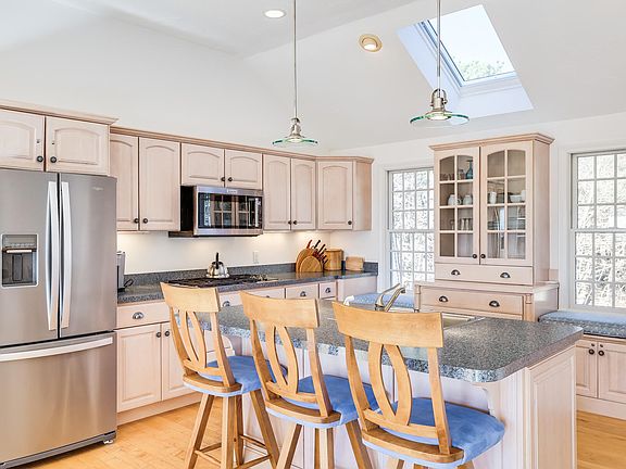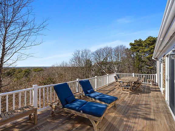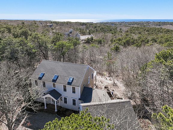 OPEN HOUSES CANCELLED FOR THIS WEEKEND! Experience breathtaking views of Cape Cod Bay from this elegant, contemporary colonial nestled in a secluded setting, boasting central air and a two-car garage. The upper level exudes a sense of spaciousness, featuring a kitchen, living, and dining areas adorned with cathedral ceilings, exquisite maple flooring, and a cozy gas fireplace maximizing the water views. This floor also hosts a private den and half bath. Floor-to-ceiling sliders open onto a sprawling deck, perfect for capturing the stunning sunsets over Cape Cod Bay.The first floor presents three generously-sized bedrooms, including a master suite with an accompanying bath and sliders leading to a private deck complete with an outdoor shower--an idyllic retreat. The spacious foyer provides ample storage space, laundry room and access to the beautifully landscaped, low maintenance yard.Being sold furnished and equipped with a security system.Don't miss the opportunity to make this dream home yours.