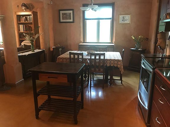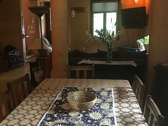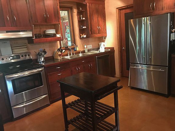 Custom designed 2-story home in East West Asheville, just a short walk from Carrier Park and The French Broad River Park. Concrete house with colorful stucco and reclaimed wood finishes throughout. Both floors have French casement windows with cellular shades and radiant floor heating. Downstairs has an open floor plan with handmade Redwood kitchen cabinetry and a wood stove for extra coziness in winter. Upstairs has a large bathroom with jetted corner tub, blackout shades in both bedrooms, and an office space that opens to stairwell. Covered front and back porches for enjoying winter mountain views in front or privacy lounging or grilling out back. Landscaped backyard has herb garden, fire pit and metal storage shed. Non-smoking property. Cats and small dogs considered with pet fee. Tenant assumes all utilities. Street parking only. Not wheelchair accessible. 12-month lease. Apply using Zillow's application with includes background and credit check.