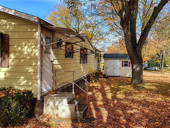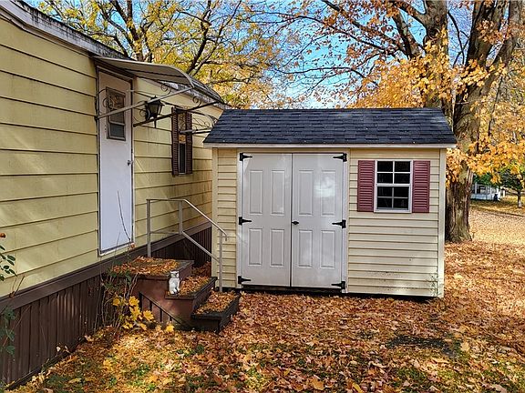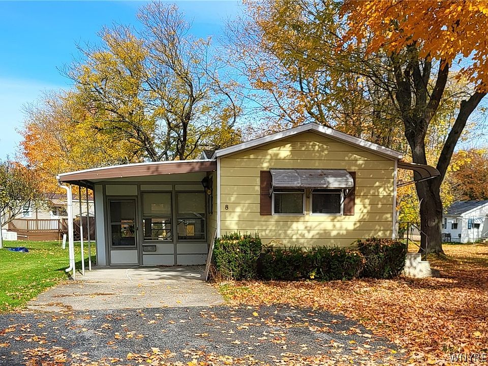 This is 8 Lakewood Village. The living room has a cathedral ceiling with a view of the kitchen. Beautiful shed and enclosed patio to enjoy the outdoors in this 55+ community.