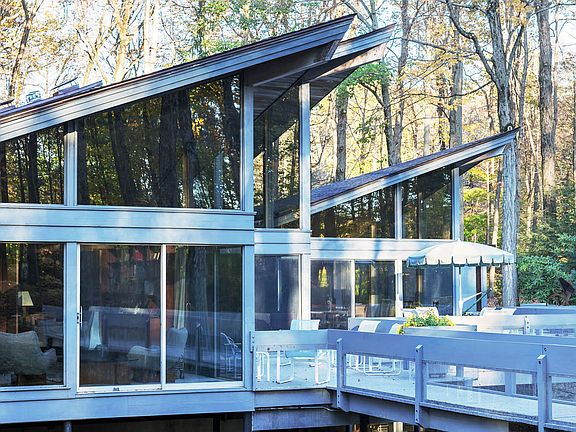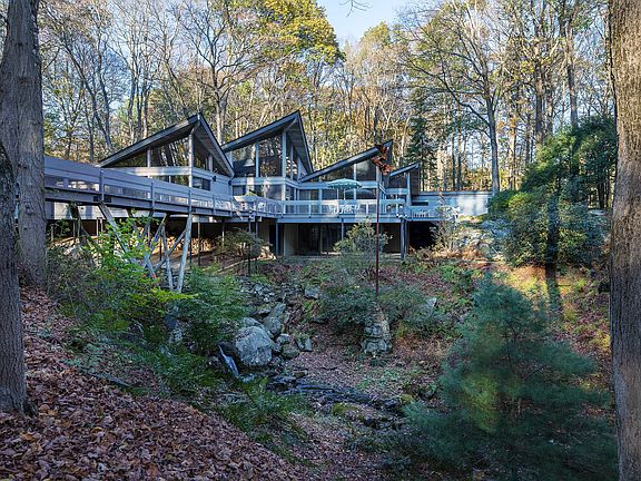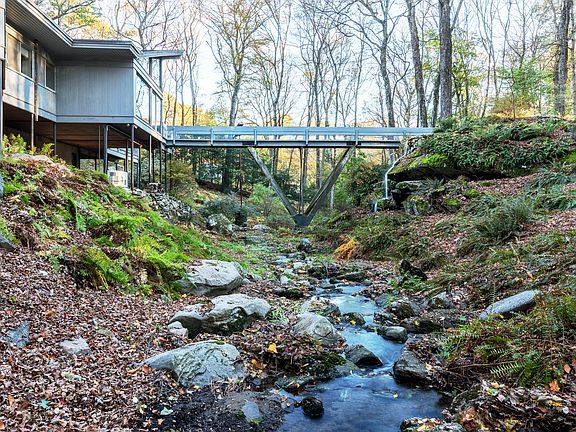 This stunning mid-century modern located on over 4 acres, minutes to town & schools, is available for the first time. Designed by J. Edward Luders & custom built for the owners, the striking roofline with double pitched roofs allows for placement of the high clerestory windows throughout the house. Using stone from the property, the chimney is the focal point of both the entry & living room spaces. The soaring walls of glass allow for views of the serene wooded property, waterfalls & stream from almost every room. There are 6 large bedrooms, 5 bathrooms, & eat-in kitchen in addition to the living room, library & dining all on one level. This sophisticated architectural masterpiece offers a unique opportunity to have your own private sanctuary convenient to everything Greenwich has to offer
