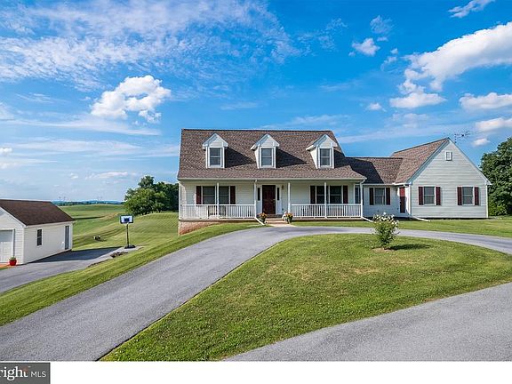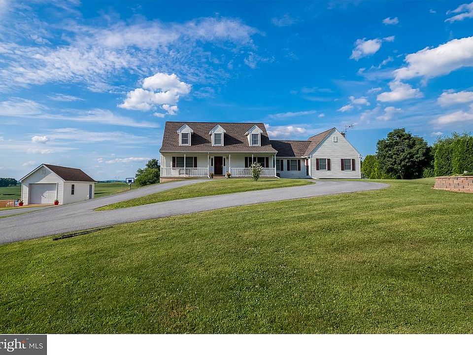 Spectacular country cape with a view for miles! This home is absolutely immaculate and has everything you can ask for in a home. Truly a home for all seasons of entertaining. As you approach the property you will notice the circular driveway with a fountain feature. The outside of this home is very inviting and there is a large country porch to sit and enjoy. There is a new 40 year roof on the home as well. As you enter the home you are greeted by a large open foyer with a den/office to the right. There is a large 1st Floor Master Bedroom suite complete with full whirlpool tub and lots of closet space. The kitchen has an island, a nice tile backsplash, new dishwasher and a large eating area that opens to a huge family room with a brick fireplace. The family room leads to the outside entertaining area. The 2nd floor has two good sized-bedrooms with lots of closet space and a full bath. The basement is completely finished with a lot of spaces for different uses. There is a huge rec room with cool built-ins and cabinets as well as a bedroom with a 3rd full bath that includes a nice stand-up shower. One of the garage bays is currently finished space but could very easily be converted back to a garage. This home is situated on an expansive 2-acre lot with gorgeous sunset views, a huge deck and an above ground pool for all of your entertaining needs. There are fruit trees on the rear of the property making it a truly quiet and beautiful area. To top it off there is a large detached garage that can be used to store all of your toys, vehicles or as a workshop. Again, a home for all seasons with a whole lot to offer.