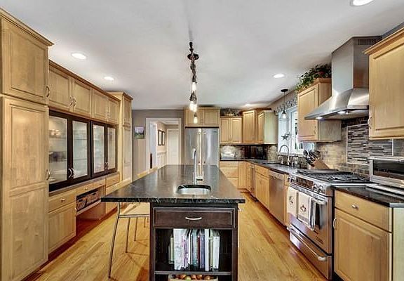 This beautiful 14 room colonial is situated on 2.5 acres and has a first floor IN-LAW with private driveway and entrance or make it into your first floor master suite. This space has a spacious kitchen updated open to family room, full bath, walk-in closet, large bedroom (all with wider doorways for wheel chair) and private deck. The main house has a large updated designer kitchen with stainless appliances, soap stone countertops, wall oven plus gas stove, tile backsplash, under cabinet lighting, large island with pendant lighting and is open to a breathtaking family room with cathedral ceiling and stone faced gas log fireplace. Formal dining and living room/study as well as all bedrooms have hardwood flooring. New central air units, 2 decks, 2 car garage and partially finished basement. See floor plan attached.