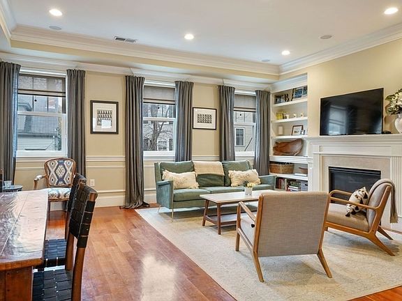Tucked off Monument Square on a gas lit street, this spectacular private entrance, 2BR/2.5BA, PH duplex feels like a single-family home. The elegant and spacious living room features a gas FP flanked by custom built-ins, gorgeous crown molding/wainscoting, and is open to a generous dining space. A stunning chef's kitchen w/white shaker cabinetry, and island w/bar seating, overlooks the living/dining great room. French doors to a Juliet balcony offer serene landscape views. A half bath is conveniently tucked off the living space. The upper level features a beautiful master bedroom w/crown molding, a doublewide closet, and a gorgeous full bath w/marble topped white vanity, marble mosaic floor, and glass enclosed shower; plus, a large bedroom w/ensuite bath w/tub, doublewide closet, and custom built-ins. A full staircase leads to a spectacular private roof deck with Monument views and gas line for grilling. Distinctive features: plentiful storage throughout, built-in Sonos system, C/Air.