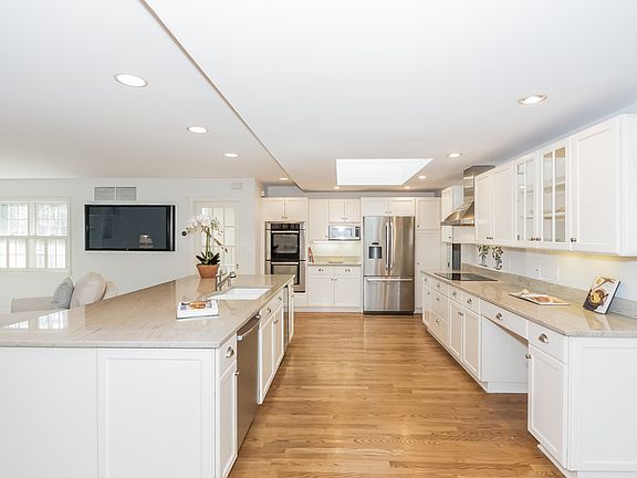 Great house, great price, great spot! This expanded and renovated home has 4 BRs, 4 full baths, amazing GREAT room kitchen/Family room, dining room, living room w/fplce, plus a finished walk out lower level with fireplace and full bath. Plenty of room for storage too with 2 car garage, and unfinished workroom area of basement. Situated on a bucolic 1/2 acre with a stream running, landscaping, wooded areas, and little bridge, it feels like you are miles away yet you can walk to train and town. Great home to raise a family in or scale down to.