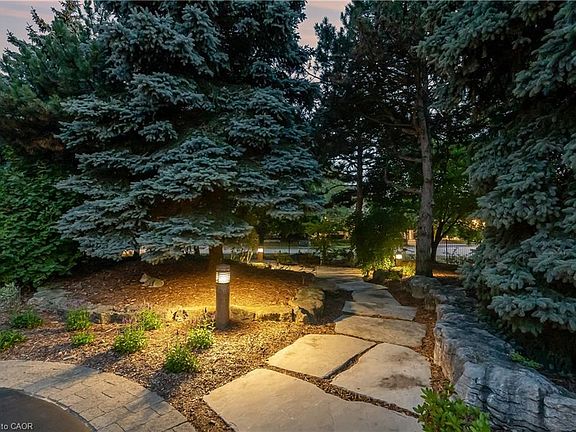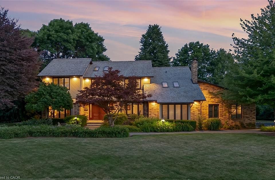 LAKESIDE LUXURY - One-Acre Estate Lot. Discover refined living in Stoney Creek’s most coveted executive lakeside enclave. Custom-built w/over 5,400 sq. ft. of total living space, steps from Fifty Point Conservation Area & Marina, across from Lake Ontario. The soaring foyer welcomes you into a home of peaceful sophistication. Chef’s eat-in kitchen is the heart of the home: stainless steel appliances & granite countertops. Imported hardwood floors add warmth & timeless style. Main floor family room impresses w/vaulted ceilings & wood-burning fireplace w/natural brick surround, creating an elevated layout rarely found. Formal dining room, private office, living room, large bathroom, & mudroom w/laundry complete the thoughtfully designed main level. Upstairs, retreat to the expansive master suite w/spa-inspired five-piece ensuite: standalone tub, rejuvenating spa shower, granite finishes, & heated floors. Versatile lower level offers a remarkable recreation space w/pool table, mounted flat-screen TV, integrated sound system, gym, & ample storage areas, w/potential for an in-law suite. Enjoy outdoor dining beneath the covered portico, surrounded by mature, unique trees, professionally landscaped gardens, & a fully irrigated property. Space abounds w/potential for further customization to create your dream outdoor oasis. The grounds are a masterpiece of nature w/private sitting areas & a fire pit. The home has been continuously upgraded inside and out. 2025 updates include: new roof (50-year transferable warranty), skylights, dual sump system, renovated 3-car garage w/epoxy floors. The 22,000W Generac backup generator is hardwired to power the entire property in the event of a power outage. Minutes to top-tier amenities, QEW & Toronto/Buffalo airports & is at the gateway to Niagara’s Wine Region. The quiet cul-de-sac location offers the ultimate family-friendly sanctuary. This is more than a home — it’s a lifestyle of peace, privacy, & captivating views of Lake Ontario.