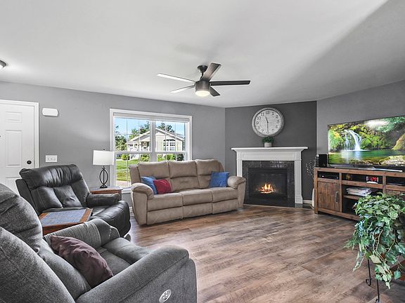 Immaculate 2-bedroom, 2-bathroom manufactured Ranch in charming Mill Pine Village, a 55+ community, awaits YOU! This pristine home boasts a range of features designed for comfortable living, including a 2-car garage and a full basement ready for your personal touches. The single-level layout ensures ease of living, making it perfect for a variety of lifestyles. The living room boasts a fireplace and remote electric blinds, adding both style and convenience. The spacious eat-in kitchen is a highlight, complete with pristine white cabinets with pull out drawers, stainless steel appliances, a convenient kitchen island, and slider access to the back deck. Working from home has never been easier with a private office featuring elegant French doors, providing a tranquil space for productivity. The primary bathroom has been recently upgraded with a brand-new walk-in shower, adding a touch of luxury to your daily routine. With plush wall-to-wall carpeting, both bedrooms offer a cozy retreat filled with ample natural light, creating a warm and inviting atmosphere. If you need extra parking, worry not – this home offers added parking in the rear for your guests or additional vehicles. Additional features include central heat & central air for year-round comfort, as well as a generator hookup for peace of mind. Simply move in and enjoy!