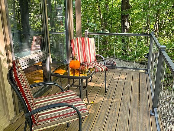 Big things come in small packages! Distinctive Mid-Century Modern–inspired 2 bedroom, 2 bath Bartoli Ridgetopper with contemporary treehouse vibes tucked away on a beautifully wooded .74-acre lot just minutes from the Owners’ Club and Lake Galena. Light and bright living room is wrapped in glass for spectacular wooded views and is highlighted by porcelain tile floors, exposed beams for dramatic architectural flair, and access to a full bath with updated vanity, fixtures, and flooring. Sleek and functional kitchen offers glossy gray cabinetry, granite counters, on-counter cooktop, stainless sink, and convection microwave, all highlighted by more tile flooring. Retreat to the primary suite with floor-to-ceiling windows and private bath featuring upgraded vanity, fixtures, and flooring. A versatile guest bedroom doubles nicely as an office, den, or additional living space, and has ample storage space. Spiral staircase leads to a unique pedestal level sitting area with tile floors and walk-out access to yard space below, complete with fire pit and picnic area for outdoor enjoyment. Expansive wraparound deck, recently updated with composite flooring and contemporary cable railings, creates multiple spaces for entertaining, relaxing, and taking in the serene, wooded setting, abundant nature, or beautiful starry nights. Incredible central location provides easy access to all amenities of The Galena Territory, including Owners' Club with indoor pool, outdoor pool, fitness facility, game room, multi-sport gym, tennis courts and more, scenic Lake Galena with newly built Marina and Pavilion, and miles of gorgeous paved and unpaved trails. Just minutes from Eagle Ridge Resort & Spa's 63 holes of golf, multiple restaurants, The Country Store, and the newly renovated Stonedrift Spa. Come experience this uniquely wonderful Galena Territory retreat, where architecture, nature, and lifestyle converge. Sold furnished with some personal exclusions and to be transferred via separate bill of sale. Private road maintenance assessment is yearly and is $220 in 2025.