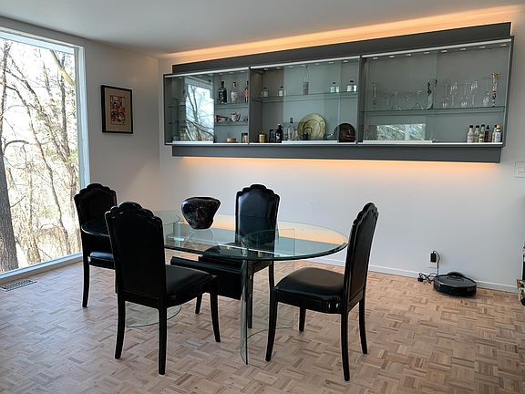 Large, open-concept kitchen/dining/living space with wrap-around, floor-to-ceiling windows, wood-burning fireplace, and balcony. Living area faces south & west for beautiful afternoon light and stunning panoramic views of sunset. Given orientation and elevation of house, huge windows won't impinge on privacy and you rarely see your neighbors from indoors. A secluded feeling right in the center of Ithaca. One-of-a-kind house designed and built as retirement retreat for architect Nancy Boodley Hanshaw and contractor Frank Hanshaw. Layout allows for single-floor living with living-dining-kitchen space, oversized foyer, 3 bedrooms and 2 bathrooms on entry-level top floor. Soak in the morning light in spacious master bedroom with king bed on SE corner of house. Master bedroom has three closets, large windows and sliding glass door to stone patio. Master bathroom boasts extra-large vanity and mirrors, two walk-in closets, and oversize soaking tub. Two additional bedrooms share recently updated second bathroom. One of those two bedrooms is currently set up as a second home office, but could reconvert to bedroom easily. On lower floor, huge office space (16' x 22') with BDI automated adjustable-height desk, leather office chair, bookcases, etc. Office faces south & west with floor-to-ceiling, wrap-around windows plus door to back yard. Great home gym set-up with Spinning bike, cable machine/weights, and yoga/barre space amid natural light and views of nature. Ample storage space throughout house: closets in each bedroom, hallway, & master bath; huge basement; and 2-car attached garage. 55-inch wall-mounted TV. Hidden wireless speakers. Recently refinished floors, cabinets and countertops; updated light fixtures; new, top-of-the-line dishwasher, washer & dryer, robotic vacuum; etc. all make for clean and comfortable living. Tastefully decorated, fully furnished, stocked with kitchen gadgets, linens, etc. House sits at the end of a serene cul-de-sac. Large yard with stone patio and walkway, abundant trees, flower and herb gardens to enjoy spring through autumn. Friendly neighbors are mostly faculty & their families or retirees. Gorgeous neighborhood for scenic walks or bicycling. Feels a million miles away, but just a five-minute drive to Cornell (easy commute by bike or foot), coffee shops, restaurants, health services, gym, shopping. Two major bus lines three to four blocks away take you to campus, mall, downtown, airport. We are open to renting our car to whoever lives in the house. Lease for academic year, late August to May. Exact dates negotiable.