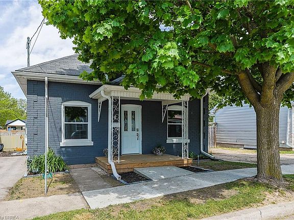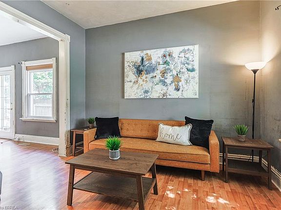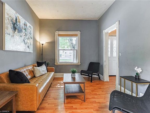 Welcome Home to this double-brick Brantford Cottage. Radiating undeniable curb appeal with mature trees and a backyard oasis. From the moment you arrive, you'll be drawn in by the beautifully maintained exterior, mature landscaping, and inviting front porch. Step inside and discover a home full of personality, ready for your handy expertise. While some interior updates are needed, the solid bones and thoughtful layout provide the perfect canvas for renovation and customization. Offering 1,150 sqft, you have ample space for your family to grow into with the possibility for a fourth bedroom, high ceilings, and a large dining room. A main floor laundry room that has potential for shelving, counters and storage to make doing laundry your favourite chore! The real showstopper is the backyard—a true sanctuary. Whether you're sipping your morning coffee on the patio, gardening, or entertaining friends, this lush and private outdoor space is your own personal retreat. Ideal for buyers with vision, this home offers incredible value and the opportunity to create something truly special. This home doesn't just look pretty on the outside, it offers great updated features! Furnace, AC, soffits, eavestroughs, front door and most windows completed in 2021