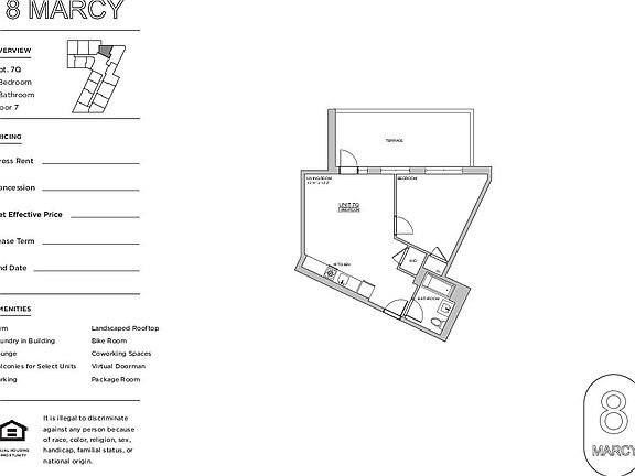 **Welcome to the Brand New 8 Marcy Avenue** **Private terrace** Williamsburg at Your Doorstep! Designed to bring the beauty and serenity of scenic rural landscapes to the urban reality of life in the city , 8 Marcy Avenue is a stunning hybrid of nature and metropolitan living. The warm, wood tones of the well-appointed residences, the greenery, and cozy cabanas on the roof deck, and all of the attention to detail in the building plans, enhance a unique oasis of tranquility in this boutique building in the heart of a bustling section of Brooklyn. **The Residences** From the warm, wooden tones to the extraordinary natural light, your new home at 8 Marcy Ave was designed to blend the outdoors with the indoors, stepping inside these boutique residences fills you with an innate sense of calm and comfort. **Every apartment at 8 Marcy Ave features -Custom Oak Cabinetry -Organic White Caesarstone Countertops -Natural Tumbled Pebble Tile Backsplash -Seaport Ceramic Tiling -Rain Showerhead -Natural Wood Flooring -Recessed LED lighting -Stainless Steel Bosch Refrigerator/Freezer -Bosch Dishwasher -In-Unit W/D **Amenities** Here, you'll find more than the customary amenities of luxury living. From top to bottom, 8 Marcy Ave was designed to accommodate all you could want or need from a modern city apartment. Amenities include: -Fitness Center -Rooftop -Bicycle Storage -Residents Lounge & Working Space -Recreation Room -Laundry Room -Package Room -Elevators -Parking -Online Portal Options for leasing, paying rent, and making maintenance requests. **Neighborhood** When it comes to vibrant, thriving New York neighborhoods, you'd be hard pressed to find one that stacks up to Williamsburg. From Michelin-starred restaurants to classic dive bars to nationally known music venues, 8 Marcy Ave sits at the center of an area teeming with culture and life.
