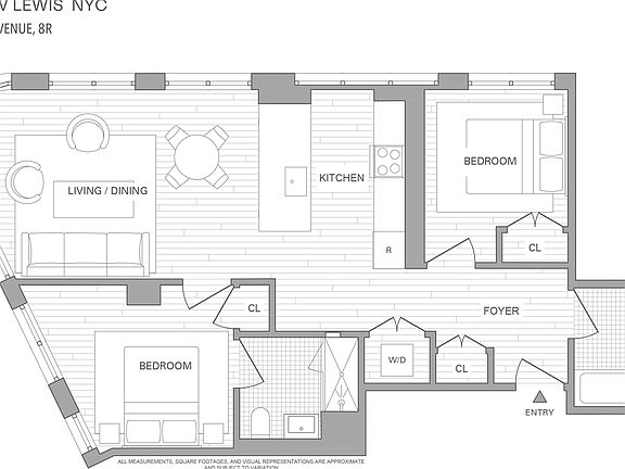 Welcome to Apartment #8R at 8 Marcy Avenue! This top floor 2 bedroom/2 bathroom apartment boasts hardwood flooring throughout, large windows with bright exposures, and in-unit laundry. The beautifully renovated kitchen, complete with caesarstone countertops, a breakfast bar, and a full suite of full sized appliances, opens to the sunny living room. There are large windows throughout with east and northern exposures. Two bedrooms are split between either side of the unit, the larger of the two containing a large closet and en-suite bathroom. Rounding out the apartment is the second full bathroom, which is completely modern and features a soaking tub. 8 Marcy Avenue is home to many modern amenities including a lush rooftop, fitness center, common lounge, resident workspaces, laundry rooms, package room, bike storage and a garage. Transportation is nearby with the Metropolitan Av G-train and the Lorimer Av L-train. Please note that images have been virtually staged and are of a similar unit in the building. Application fee: $20 per person (applicant and guarantor) Pet Rent: $25/month $7,495 First Month's Rent & $7,495 Security Deposit