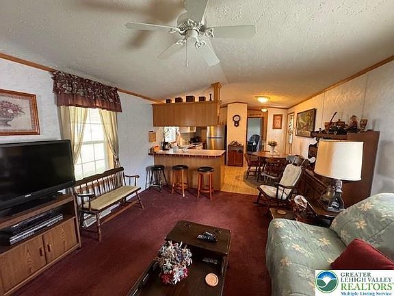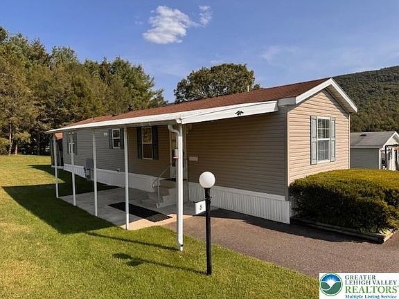 THE VIEWS HAVE IT! If you're looking for a home featuring scenic views of the Blue Mountains and minutes Blue Mountain Ski? Then look no more it's right here! Spacious 2-BR, 1.5-BA 2003 Skyline home offers continuous scenic views of the Blue Mountains! This home has been well maintained with a newer furnace installed in (2021), and hot water heater (2024). Open floor plan, spacious living room, eat-in kitchen with all appliances! A sizeable bedroom is at the rear of the home with adjoining bathroom and a primary bedroom with half bathroom at the opposite end for privacy! A covered front patio includes enough space as a carport, plus a covered rear deck to relax and enjoy the mountains views of the Blue Mountains. Detached shed (8' x 10'), equipped with a electric for a portable generator for power interruptions, central air, are just a few of the many extras this home offers! Conveniently located in Blue Mtn. View Community, minutes to Blue Mountain Ski Resort and easy commuting to LV and Pocono Tourist attractions! $490 mo. lot rent incl., W/S/G. BUYERS: Please make sure you're approved for manufactured home financing. VA, FHA, USDA or Conventional mortgages will not qualify for these homes. Call listing agent with any questions. Call for your personal showing appt. today!