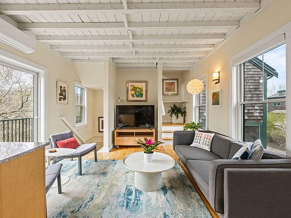 Three floors of stylish living in this triplex townhouse! This one-bedroom plus den with one and a half baths condo feels larger than its 828 square feet. Enjoy the bonus of a separate studio-guest quarters across the covered deck on the first level, with a convenient half bath on this level. The second floor living level boasts an open floor plan with a large kitchen featuring granite counters, stainless steel appliances, and natural wood cabinets. Relax in the generous living room with pine flooring, sliders to a charming coffee-cocktail deck, and large windows offering sunny east views and west views of the bordering conservation land. The top-floor primary suite is a true retreat, big enough for a sitting area. Nine-foot ceilings, a full bath with a tub/shower, and two walk-in closets (one with a washer/dryer), this space is flooded with natural light from six windows. Expand your living options with a private fenced-in patio on the entry level, perfect for outdoor dining and storage for bikes and kayaks. Split systems for AC and baseboard hot water heating. Professionally managed by Cape Associates. Condo fee covers maintenance, landscaping, master insurance, and and snow removal. Pets allowed. Seller will consider requests for Buyer concessions. Offered furnished with seller exclusions.