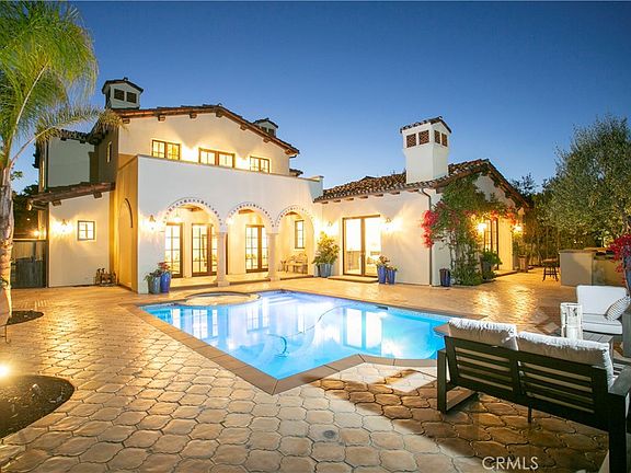 This beautiful Spanish estate is a one of a kind custom built home in the prestigious gated community of Covenant Hills. This home is an entertainer’s dream with a Coastal Santa Barbara architectural style and feel with a gorgeous pool, panoramic views, a gourmet kitchen, new hardwood floors, gorgeous wooden crank windows, and exquisite french doors, perfect for indoor/outdoor living. This estate features a formal office, private downstairs in-law suite, a spectacular large formal living room/dining room that is an entertainment show piece; with two fireplaces, surround sound, and multiple french doors leading out to the pool - perfect for indoor/outdoor living. The kitchen is stunning with cathedral beamed ceilings, two large center islands, all high end Viking appliances, an 8 burner range, two ovens, two dishwashers, a huge walk-in pantry, and a built-in desk area. The kitchen is open to the family room and showcases panoramic views of the hills. The family room has a full bar, surround sound equipment, a beautiful fireplace, and pocket doors open to the pool area. The dramatic wrought iron spiral staircase leads you to a generous master suite where you will enjoy spectacular sunrise views. Complete with recessed ceilings, a beautiful fireplace, french doors open to two generous outdoor balconies, a lovely master bath with walk in shower with dual shower heads, a luxurious jetted tub, his and her vanities, and a custom walk-in closet. The secondary bedrooms are very spacious, complete with ensuite bathrooms and walk-in closets. There is an added upstairs bonus room that could be converted to a 5th bedroom as well. The exterior has it all, perfect for entertaining with a large pool and spa, custom Spanish tile decking, covered entertainment space, outdoor kitchen with BBQ, Fridge, and seating, all with unobstructed panoramic views. There is a gated motor court leading to double two car garages, with high ceilings, built-in storage and windows. The lush landscaping is breathtaking with mature trees, grassy lawn, and fountain. This home is located on a culdesac, close to great schools, hiking/biking trails and offers all of the amenities of Ladera Ranch. Don’t miss this opportunity, it won’t last long!
