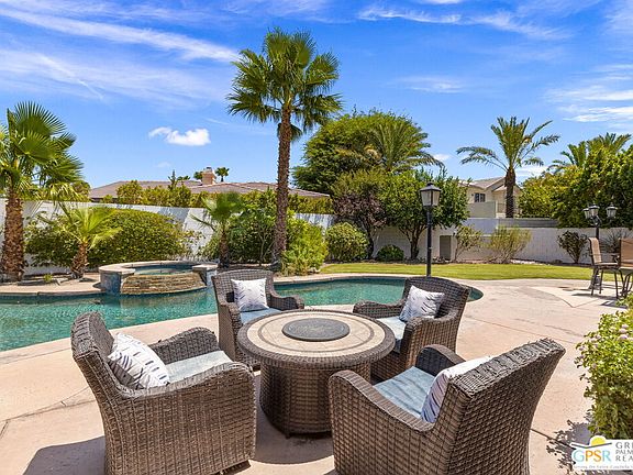 WOW! Check out this fantastic 4-bedroom 3-bath contemporary with 3,789 square-feet. Gated Versailles off Gerald Ford Drive in Rancho Mirage delivers so much of what we LOVE about desert living. This large, beautifully landscaped lot is a bit tucked away and positioned on a cul-de-sac. Once past the gated courtyard and double door entry with clerestory window overhead, you'll appreciate the mix of formal and informal living areas. Indoor-outdoor flow and natural light are themes throughout this impressive property. Take the Matterport VIRTUAL TOUR for a better sense of flow. French doors in the living room open things up beautifully to the expansive patio and a handsome built-in buffet and four skylights are highlights of the dining room. Both the family room with fireplace and breakfast room are positioned adjacent to the updated chef's kitchen with stylish tile and quartz finishes. The outdoor built-in barbecue is an extension of the kitchen and has its own sink. The nearby pebble-finished pool and spa with waterfall is framed by a series of conversation areas and takes center stage out back. The absence of power lines is always a good thing! Mountain views too. Mature landscaping surrounds and includes a mix of palms and plumeria. Onto the Primary Ensuite Retreat with fireplace and office area which features direct patio access. Dual vanities, separate tub and shower, and large walk-in closet with built-ins. Junior Ensuite Two features a bay window with built-ins, walk-in closet, and walk-in shower. Guest Bedroom Three continues the bay window theme and shares a hall bath with Guest Bedroom Four. This hallway features a series of skylights. A powder bath and laundry room with utility sink are located off the kitchen. There is also direct access to the 3-car garage. Proximity to I-10, commercial areas along Monterey Avenue, and the best of Rancho Mirage are more of what we LOVE about this location. El Paseo is also a short hop away. LOW HOA fees and quality of life it all adds up. Take a closer look at 8 Moet Court in Rancho Mirage!