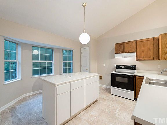 This Durham one-story cul-de-sac lot home offers a wood-burning fireplace, kitchen bay windows, living room vaulted ceiling, master walk-in closet, open deck, and a one-car garage.