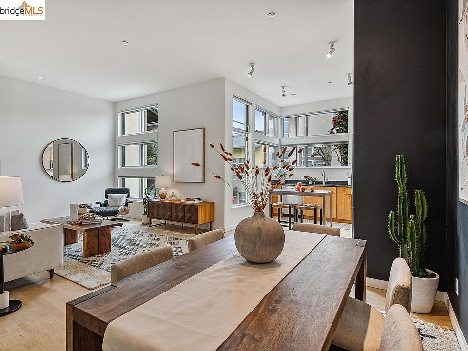 This is a gorgeous townhouse with abundant natural light, lofty 10’ ceilings, plus a deep garage (w/ EV charger) with interior access and an additional parking space right outside on the private street. This spacious, award winning David Baker designed tri-level home has two levels of living space above its flex space which includes a full bath, laundry area and polished concrete floors. The central level has an open-concept kitchen, dining, and living room all with maple wood floors. The kitchen features modern finishes, lots of storage, and stainless steel appliances. Windows to the west provide access to the beloved bay breezes. Upstairs you’ll find two generous bedrooms w/ large closets, views of the tree canopy and open sky as well as a second full bath w/ skylight. In unit laundry and private fenced patio. West End Commons is a tree-lined, gated enclave with lush established gardens on the W. Oakland/Emeryville border. Low dues of $306/mo include EQ insurance. Shopping, transportation corridors and BART nearby. The adjacent Mandela Pkwy Greenway features bike lanes, walking paths and grass lawns.