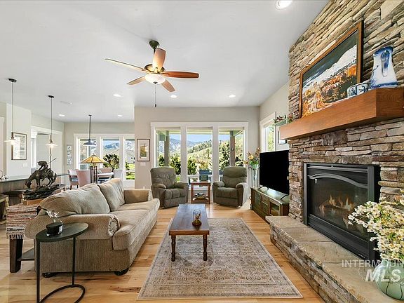 MOTIVATED SELLER! Stunning Canyon Rim Home on 6 Acres with Expansive Views & Top Amenities. Enjoy luxury mountain living in this single-level home with bonus room, on 6 private acres at a quiet cul-de-sac’s end, overlooking the canyon rim. Just 15 minutes from Boise, this retreat offers year-round access, stunning vistas, and is ideal for horses with ample equestrian space. The open floor plan features a great room with large windows, natural light, and views. The kitchen boasts granite counters, hickory floors, and entertaining space. A split bedroom design ensures privacy, with a den for work or hobbies. Outside, find garden beds, a water feature, and a 2400-gallon reservoir tank. Includes a heated 4 car sized insulated shop and 3-car attached garage. Plenty of room for storing toys. Whole House Sound System pairs with your phone or tablet.
