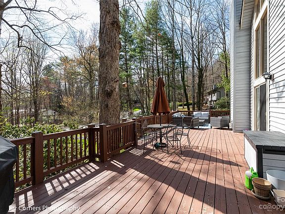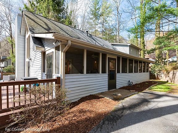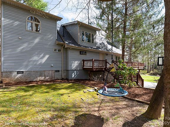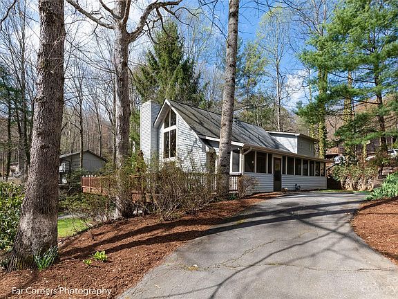 Beautifully maintained 3BR/3BA home in the quiet Royal Pines neighborhood in South Asheville. This cul-de-sac home features a huge deck overlooking a level grassy lot with a babbling creek, mature trees, azaleas & rhododendrons, and a firepit. It has two driveways and the entire property is enclosed by invisible fencing. The living room has vaulted ceilings featuring a breathtaking wall of A-frame windows, mid-century style mantle & gas log fireplace, and an open mid-century style staircase. The main level contains 2 bedrooms, 2 full bathrooms plus office and screened in porch, upstairs is a huge primary suite with a jetted soaking tub, separate shower and two walk-in closets. The basement features one finished room for additional flex space and an unfinished garage and workshop. Conveniently located less than 5 miles from South Asheville amenities including Biltmore Park Towne Square and Gerber Village, Blue Ridge Parkway and Asheville Airport. Just 20 minutes from downtown Asheville.