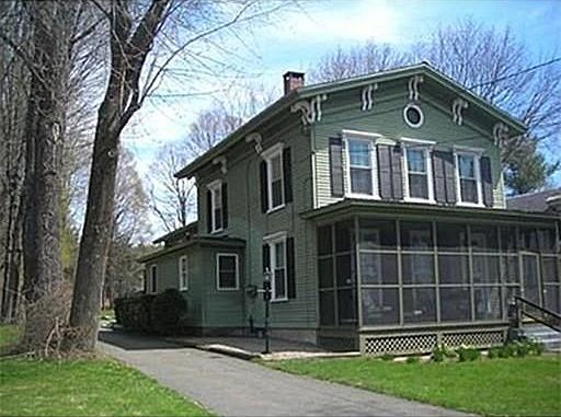 This gracious & comfortable home has a lovely bay window in the living room, an elegant staircase up to the 2nd floor. 2nd flr. may be used as an apartment. Charming light fixtures & doorbell. Relax on the south facing screened front porch where you can hear sounds of the river. Patio in the back overlooks the large level yard. Carriage house makes a a great studio/ workshop. Front parlor with floor to ceiling windows is can be used as a bedroom. Study with built-ins could also be a bedroom. Dining room has a wood stove & a door to a small side porch. 1st floor bath & laundry. Two levels in study/family room in the back of the house. Upstairs are two more bedrooms, sitting room, kitchen and full bath with skylights. The second floor does have a separate access so it could go back into being a legal two family. 2 electrical panels, one furnace. Walk into the charming village center where there is a library, grocery store, country store, bank, restaurants, & elementary school.