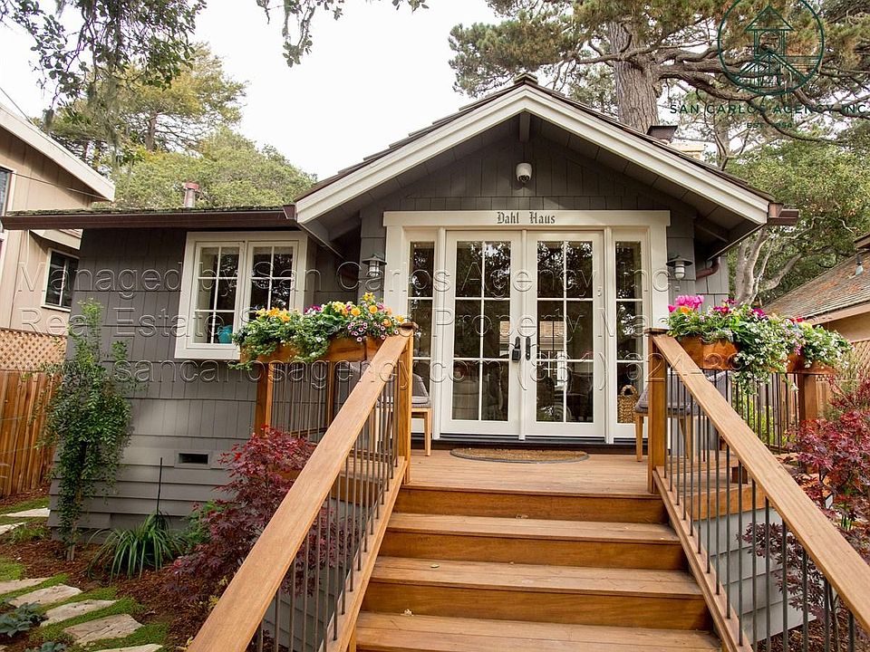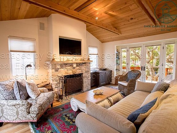 (KEMPA) San Carlos Agency, Inc. offers "Dahl Haus" - a beautifully updated Carmel cottage offered furnished or unfurnished. This 3 bedroom (king, queen, twin), 2 bath is perfectly located just a few blocks to both downtown and Carmel Beach! Wind your way through the Carmel stone path through a lovely maintained garden leading to a wood deck and French door entry. Enter into the incredibly comfortable and well-appointed living room with wood burning fireplace, flat-screen TV and built-in surround sound. Dining area off living room seats 6 comfortably. Gourmet kitchen has beautiful "amazonite" granite counters, gas range, dishwasher, and under-counter refrigerator and freezer. Down the hall from the kitchen are French doors that open to a spacious back deck with propane BBQ, table and comfortable seating. Across is the third bedroom with day bed. Guest bedroom (queen) and guest bathroom (tub/shower combo) are towards the end of the hall. Master suite (king) opens to the deck and has a spacious en suite bathroom with heated floors, double sinks, jetted tub and separate shower. Hardwood floors throughout this very charming Carmel abode. Laundry room with washer/dryer in hall (left as a courtesy to tenants). NO PETS. No smoking.
