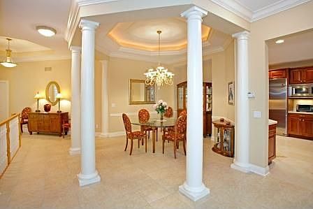 Attention to detail in this 3 BR/3.5 Bth villa is hard to equal. Spcl millwork, coffered ceilings & much more. The grand entry w/11 ft ceiling & tile floor flows to a fabulous octagonal DR w/tray ceiling, perfect for entertaining. The GR boasts an 11' coffered ceiling, wall of windows, a gas fpl w/greystone mantle & custom bookshelves. Gourmet kitchen includes granite countertops, 42 custom cabinets, stainless steel double ovens, microwave, dishwasher & refrigerator, see thru fireplace and ceramic tile complete the look. From the deck enjoy privacy & your own garden area. The Master suite features a bay window w/transom windows, CA closets, coffered ceiling, luxury bath w/dbl sinks, & custom shower. The finished lower level has custom cabinets, wet bar w/ice maker & refrigerator, off season storage closet, bedrm & a full bth.