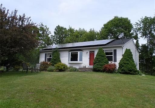SOLAR hill top ranch with a great view. 3 bed room, 2 bath, with a very nice 3 season room addition. Master with bath, Murphy bed it one bed room, nice floor plan with roomy kitchen with a laundry nook. Full basement with a drive under garage, nicely landscaped, 1.4 open acres, ready to move in. The electric bill is around $180 a YEAR including the electric hot water heater, and the solar credits pay you back quarterly. Easy access to Westfield, Mass Pike, Southampton, Rt. 91. This is a great home that helps to pay for itself.