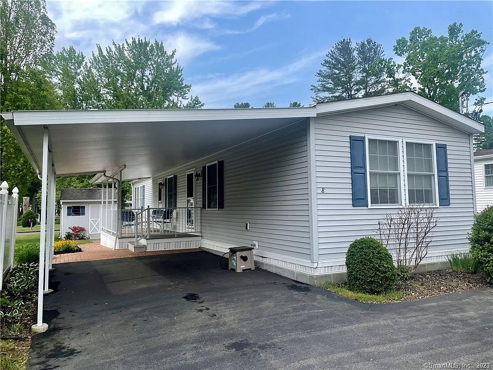 Rarely available unit in adult community. Custom New Era Construction model featuring 2 bedrooms and 1 full, 1 partial bath. Paved, private driveway includes carport parking for 1 car and leads to a covered deck for outdoor enjoyment. The large kitchen has abundant cabinetry, eat-in dining space, and overlooks the generously sized living room. Full size washer and dryer located in the hallway. This home has been meticulously maintained by its one owner. Upgrades include Anderson windows, laminate flooring, custom blinds, architectural shingles, new cooling system in 2020, and a shed for outdoor storage.