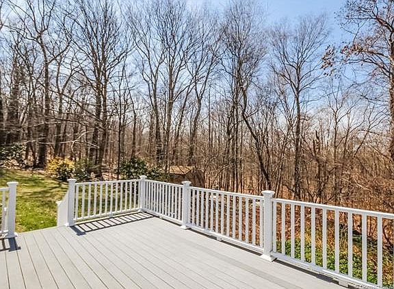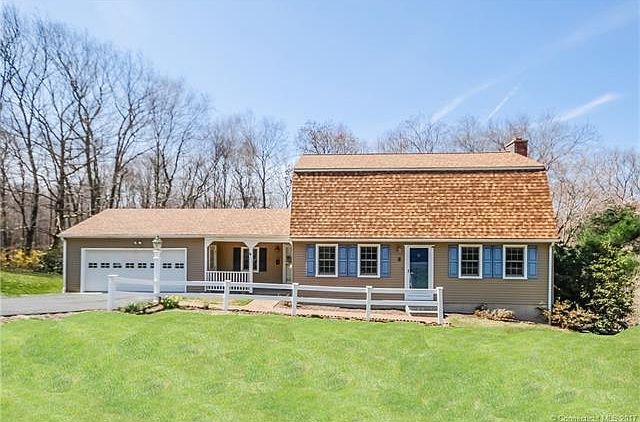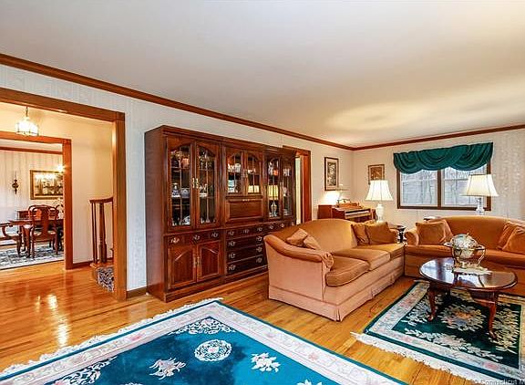 Lovely 3BR Gambrel Colonial featuring front to back formal living room with hardwood floors, crown molding and raised hearth brick fireplace; formal dining room with hardwood floors and crown molding; eat-in kitchen with quartz counters and pretty tile backsplash. Family room with crown molding and glass door sliders to deck! Master bedroom with two walk in closets and hardwood floors. Additional two bedrooms w/hardwood floors. 20x13 new deck overlooks private wooded yard and brick patio. Walkout lower level; two car garage, front porch on beautiful cul de sac location. City water; Please note updates: Windows, driveway, deck, new 50 year roof 2015,**new furnace 2017!** patio and sidewalk!