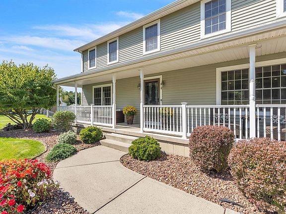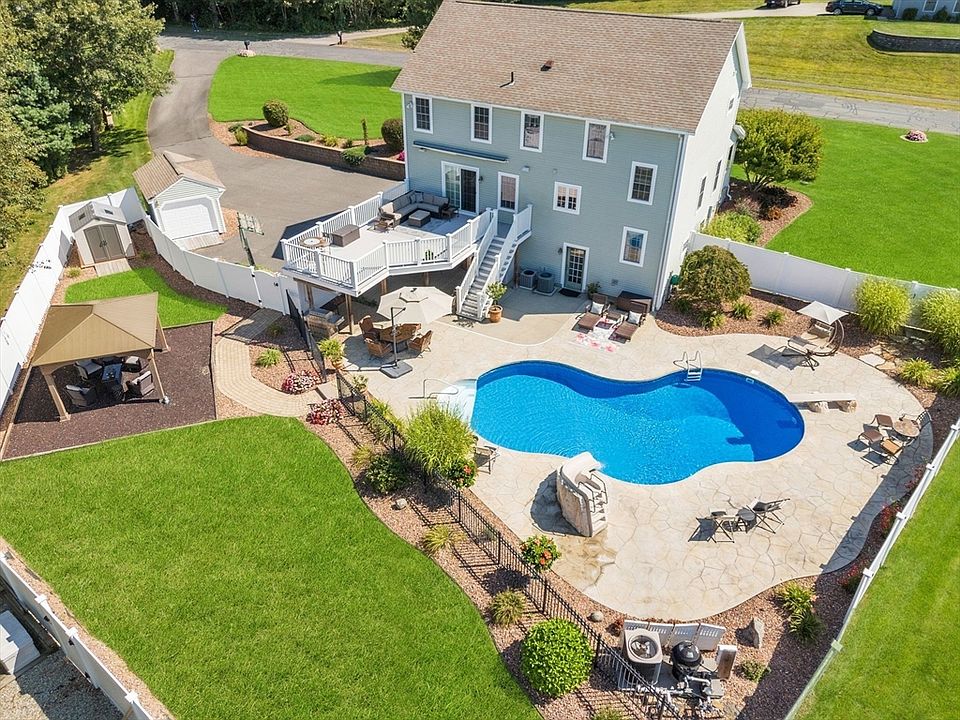Dive into summer at this showstopping backyard retreat, where joy, leisure & connection come naturally! Centered around a custom 8-foot deep, salt water pool with diving board & slide, the outdoor space offers stamped concrete surround, an upper level composite deck with retractable awning directly off the kitchen, covered patio, gazebo & a grassy side yard perfect for play, gardening or peaceful evenings by the fire. Inside, the layout flows effortlessly with a sunlit kitchen offering a convenient breakfast bar that opens nicely to the formal & casual dining areas. Spacious living room & half bath complete the 1st floor. The extra wide turned staircase leads to all bedrooms & laundry on the 2nd floor, including a primary suite with walk-in closet. A finished walk-out lower level adds even more versatility, complete with full bath for poolside convenience. Nestled in a sought after neighborhood on a cul-de-sac street, this home is polished, playful, & ready to host life’s best moments.