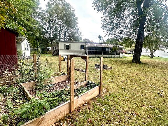 Situated at the beginning of the park on a quiet dead-end street, this 3-bedroom, 2-bath home sits on one of the most desirable lots. The oversized, level yard features raised garden beds, two storage sheds, and a patio extending from the large screened-in porch—perfect for relaxing or entertaining. Step inside to a welcoming foyer with space to kick off your shoes. The kitchen is warm and inviting with abundant cabinetry and plenty of counter space for prep and storage. A tiled backsplash adds character and pairs nicely with the wood cabinets. The double sink is perfectly positioned beneath a window for natural light, and the layout flows seamlessly into the bright dining area. Complete with refrigerator, dishwasher, and electric stove, this space is designed for both everyday convenience and gathering with family and friends. A step down brings you into the spacious living room, highlighted by oversized windows that fill the space with natural light, and a pellet stove that adds both charm and efficiency during the colder months. The home offers two well-sized bedrooms with large closets that share a full bathroom with tub, while the primary suite includes its own ¾ bath. With fresh paint throughout, this home is move-in ready and waiting for its next owner to enjoy both comfort and convenience.