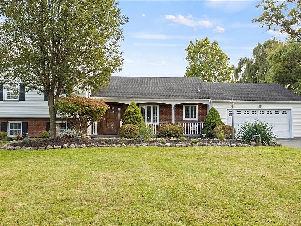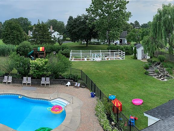 Welcome to 8 Prospect Hill Dr. conveniently located in the heart of Pittsford. 5 Min. from 490/590 expressways, Pittsford Plaza, and Wegmans food market. Escape in your private paradise with the backyard featuring an inground pool, water feature, gated garden, children's playset, and shed. Enter your home through a beautiful Mahogany front door to an exquisite chef's kitchen complete with granite countertops, New stainless steel appliances including double ovens and gas stove with airfryer function and HEATED FLOORS! Additional heated flooring in both the primary and main bathrooms!!! Brazilian cherry hardwood floors expand throughout the living and into the dining area. The living room also displays a Riverstone wall accent, gas fireplace, and built-in wardrobe closet. The cozy family room has a wood-burning fireplace with space for the kids to play. NEW water heater, NEW electrical panel 2022, NEW solar panel installed in 2022 on the backside of the roof, NEW heater, liner, and pool pump in 2023. Delayed Negotiations begin on 10/22 at 9 AM. Open houses on Friday 4:30-6:00 PM, Saturday 11:00-1:00, and Sunday 11:00-1:00.