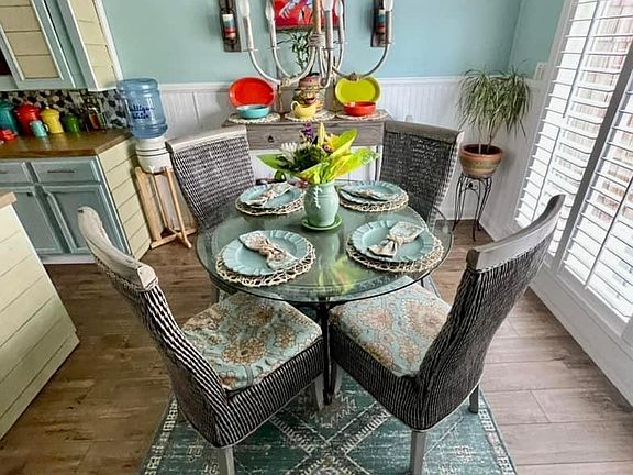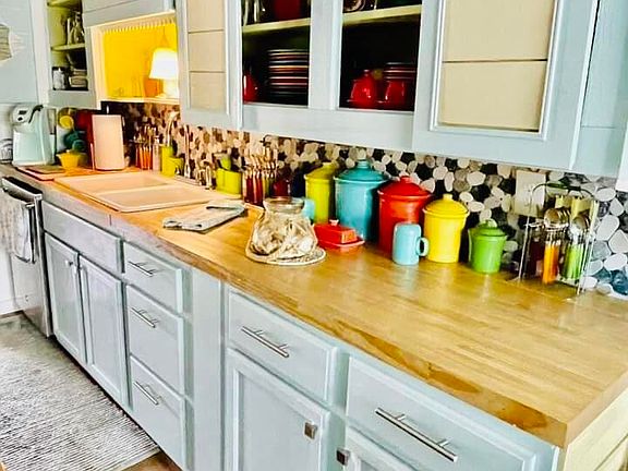 Shiplap ceilings in most rooms downstairs, butcher block countertops in kitchen, laminate flooring.