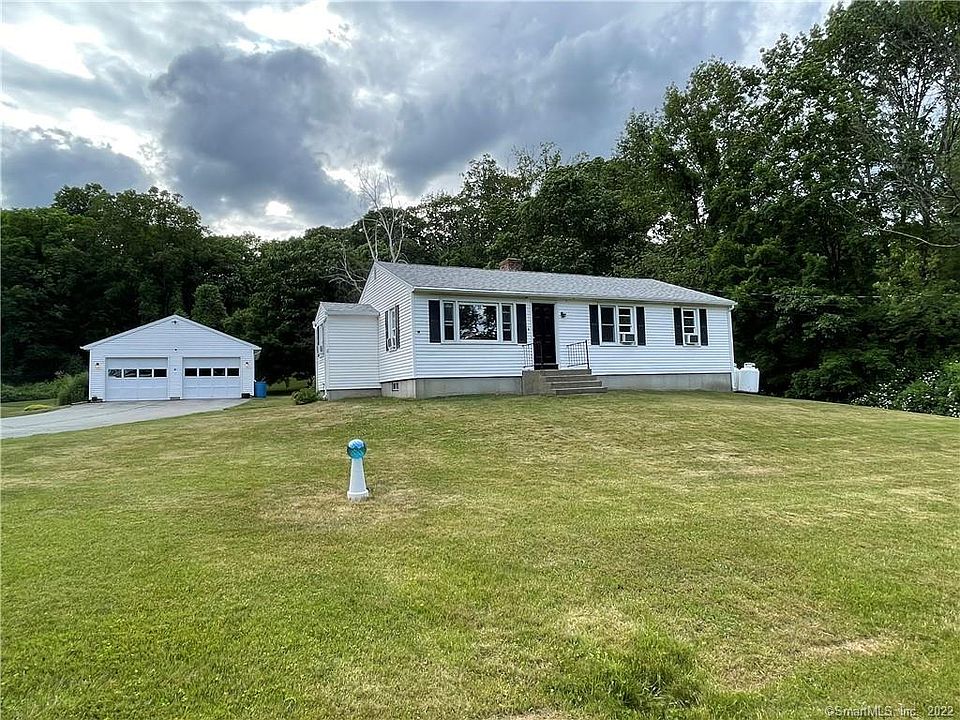 Great Ranch style home located on a nice flat & grassy almost 3 acre lot. Home features a newer roof, newer boiler, vinyl siding, replacement windows, 2 car detached garage & multiple storage sheds all in good shape. Entering the rear breezeway you will walk into the eating space kitchen that is very serviceable and offers plenty of updating options. The front living room is spacious and will gather great sunrises in the winter. There are three good sized bedrooms all with generous closets located on the first floor. The bathroom has been updated and features a full shower/tub surround. The basement offers plenty of clean and dry storage along with the washer/dryer and the bonus is a 580+ sq. ft. finished heated room with a nice stone fireplace. Home also features a whole house automatic propane generator. Multiple offered received. Seller is requesting highest and best offer by Sunday 6/12 midnight for a response Monday.
