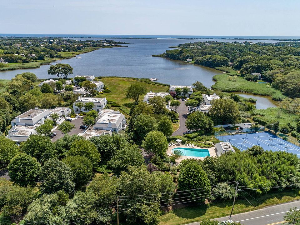 Spend your summer in this south of the highway bayfront condo community. This newly renovated three bedroom condo offers an open living floor plan, ideal for entertaining. Enter a light-filled foyer looking out through glass doors to a private deck area for outdoor relaxation, dining and grilling. The first floor has a spacious great room with a fireplace, dining area and large kitchen. The primary suite is on the second level with two additional guest rooms. There is a finished lower level with a media area and another full bathroom. Community amenities include a heated gunite pool, two tennis courts, boating docks, and direct Mecox Bay access for kayaking or paddle boarding. Only a stone's throw to ocean beaches.