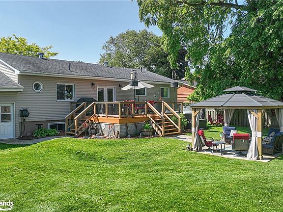 Charming Raised bungalow nestled on sprawling 101' x 152' fenced lot in the desirable West Ward of Orillia. Completely renovated in 2015, w/main floor raised to enhance basement height, this home offers modern comfort & ample space. Open-concept living/dining area w/hdwd floors, provides versatile space that could easily be reconfigured to include a 3rd Bdrm. on the main floor. The gorgeous Eat-in kitchen is a chef's delight, w/stainless steel appliances, a center island, plenty of cabinets, double sink, & a walkout to 19' x 16' deck w/Hot tub. Mn flr w/2 spacious Bdrms., incl. Primary Bdrm.w/walk-in closet & luxurious 4pc ensuite w/Soaker tub. An additional 4-pc main bath also boasts a soaker tub. Convenient inside entry from Garage to the Kitchen plus direct access to a full, finished basement—perfectly suited for an in-law apartment. The basement is a highlight, featuring a massive Family room w/built-in bar & engineered hardwood floor, a 3rd Bdrm w/double closet, 3-pc bath, Laundry room, Utility rm. and a large storage room. Attached garage (inside dimensions 23'4 x 23'7) is complemented by a detached garage/workshop (exterior dimensions 24' x 23') w/two lean-to's for additional storage. The serene backyard is nestled behind a privacy fence, & features a patio area w/gazebo, and raised garden beds. The 2015 renovation also included new siding and extra insulation, enhancing the home's energy efficiency. Picturesque property combines modern amenities w/a tranquil setting