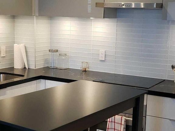 Large balconyModern kitchenTrendy backsplashStainless stoveWasher and dryerLaminate flooringElegant lobby lounge