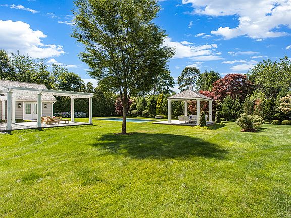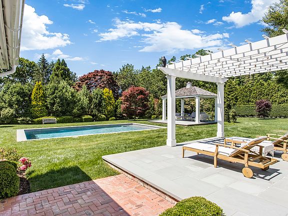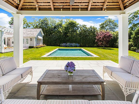 Located directly next to Bellport Country Club in Bellport Village South, this charming home features spectacular outdoor living with a heated gunite pool, an outdoor shower, a spacious pergola with a grill, and a gazebo. The property consists of 2 structures: a main house and a pool house. The first level of the main house features a cozy living room with a wood-burning fireplace and wood floors throughout. Adjacent is a TV room/den with pocket doors that could potentially be enjoyed as a guest bedroom. This area also includes a full laundry closet and a half bath. Enjoy daily breakfast in the well-appointed kitchen overlooking the pool and the property's exquisite landscaping. The light-filled kitchen boasts stainless steel appliances and custom-cabinets throughout. The second level hosts the primary bedroom and a full bathroom. A spacious pool house featuring a wet bar with wine refrigeration and a full bathroom completes this home. Additional features include CAC and a 2-car detached garage, and cedar shingled roofs. Enjoy all that living in Bellport Village has to offer with ferry access to Ho Hum Beach and a short distance to all village amenities. (Village taxes to follow)