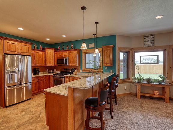 Meticulously landscaped home situated on 2.82 acres located in the Sandstone Subdivision with 360 degree views. Home offers a 1200 sq. ft. RV garage with a clean out plus an oversized 2 car garage with a workshop. This 3,568 sq. ft. home has a large master bedroom suite on the main level plus another bedroom/office. The kitchen has Alder cabinets, stainless steel appliances and granite counter tops along with two pantries. The living room has a wood burning fireplace and patio doors opening up to a covered patio. There is a formal dining room, large laundry room and a half bath. Almost every window in the home offers views of the Big Horn Mountains. The upper level has 3 bedrooms, a full bath, family room, theater room and finished storage room. Seller prefers closing at end of October.
