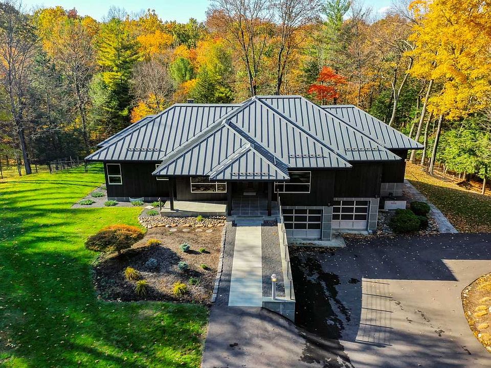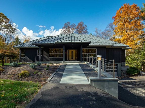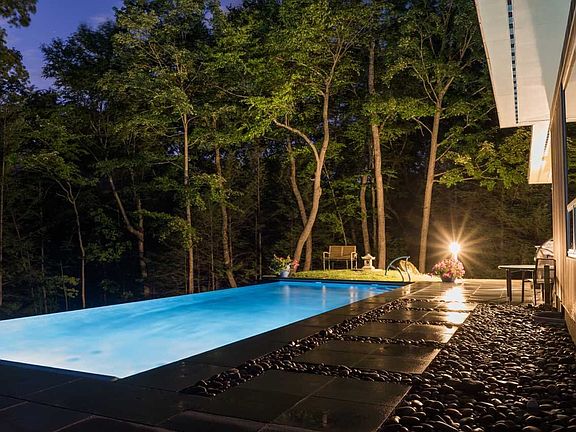 Sophisticated home privately sited minutes to the Villages of Rhinebeck and Red Hook. The exterior; wrapped in redwood siding, a standing metal seam roof, Optimum windows, bluestone walkways and mature gardens, set the stage as you then enter the gorgeous interior. The design of the house was thoughtfully and beautifully integrated to create an expansive open feeling while providing independent spaces. The integrity of the design is enhanced by the quality of the components used in the construction. Beautiful Amitico tile and Mirage maple floors, Siematic kitchen cabinets and Meile appliances enrich the design. Propane fired, radiant heat is thoughtfully placed throughout the house, including the lower level and the garage. A heated gunite negative edge saltwater pool, installed by NeJame Pool Artisans, blends into the stunning, natural setting of this exceptional home.