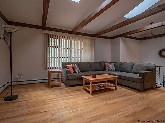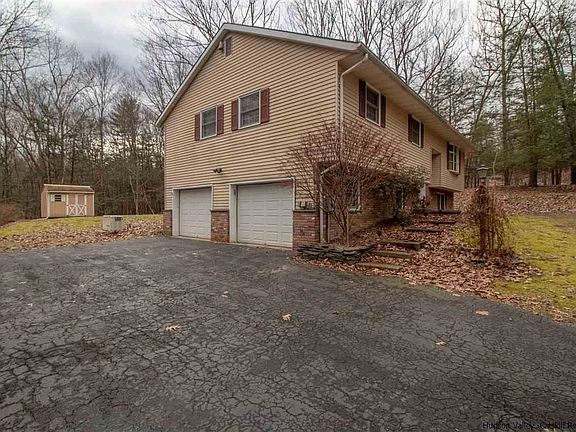 WELCOME HOME! Beautifully nestled on 2 acres with pet, play and garden friendly lawns framed by natural woodlands, discover this inviting high ranch on a quiet country lane just minutes to vibrant Woodstock village shops and services. The easy living floor plan features a main living level with a beamed and skylit living room, formal dining room with sliders to deck for al fresco entertaining, eat-in sized kitchen with loads of cabinet storage and counter space, 3 bedrooms including an ensuite MBR and 2.5 baths. Hardwood and laminate flooring add a warm and cozy glow. A spacious 24" family/media room downstairs boasts a brick fireplace with pellet stove insert. The perfect place to chase the winter chill. Direct access to a two car garage is so convenient and a stand by generator offers peace of mind no matter what the weather. This nicely maintained home awaits your own personal taste and style in a hard to beat location. Take a look today!