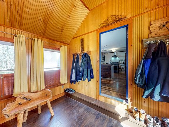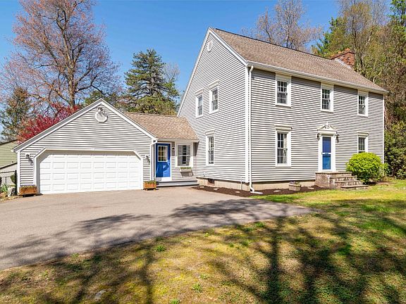 Tucked back on its lovely lot is this 3-4 bedroom saltbox colonial. Updated easy to entertain in kitchen is spacious and OH SO PRETTY. Large living room features a local stone floor to ceiling fireplace & fabulous hardwood floors. The dining room has french doors that open to the enclosed porch that is perfect for out door dining or lounging. Master bedroom with master bath features a walk in closet and lots of windows to let in the natural light. The fenced yard is pet friendly and offers a Klotter Farms shed for storage.The yard abuts conservation land with miles of trails, one short one leading to waterfalls. Great for hikers, and pets Newer roof and boiler too. Make your appointment soon so you don't miss out.