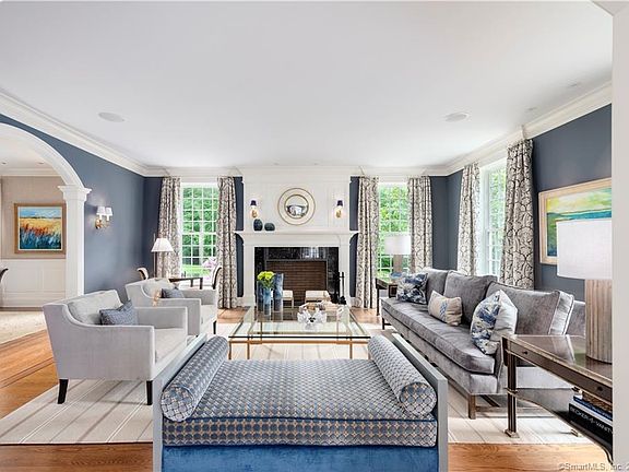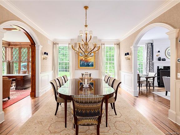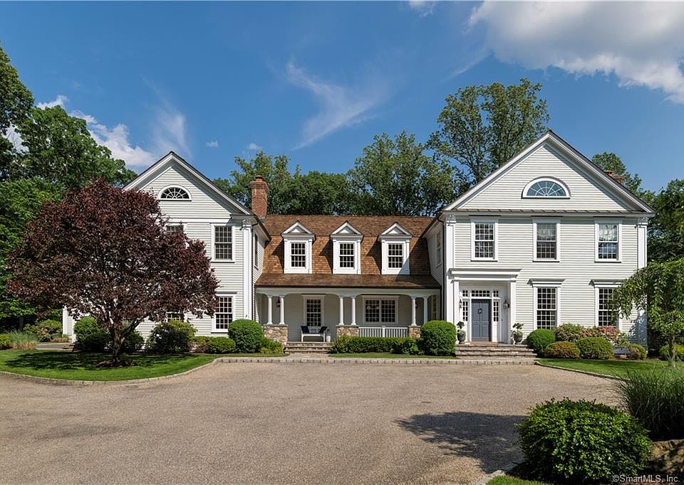 This true turnkey home completed in 2010 features a perfect blend of both formal and casual living with beautifully proportioned light-filled rooms, 10' ceilings, stunning architectural detail & impeccable craftsmanship. The open concept gourmet kitchen with a large island overlooks the casual dining area and the family room with French doors to the terrace. On the second floor, you will find a master suite with fireplace and sitting room, down the hall there are 5 additional family bedrooms, generous in size and all with en-suite baths. Once outside, you will entertain in style with the stone fireplace, built-in bar with grill, the chic pool house with high-end appliances, full bath, and an outdoor shower. The 50' salt-water pool with both spa and electric cover complete the perfect venue for outdoor fun and relaxation in this very private and picturesque setting. The home sits on 2 flat landscaped acres and is located 2.5 miles from the Darien train station.