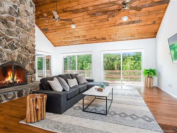 Looking for a Home that feels like a Private Retreat, Great Commuting Location, Serenity of a Semi Private Pond-shared with only one other home, on a Quiet Cul de Sac and Close to Ridgefield Town Center? It is all here in this Sun Drenched Contemporary Cape. The spring fed pond is stocked with fish & fun -kayaking or sitting by a fire pit roasting marshmallows. The large living rm with floor to ceiling stone wood burning fireplace makes an impression as you enter the home & your eye is drawn to the pond beyond thru double sliding glass doors. Beautiful vaulted wood ceilings make the rooms look & feel open & larger as well as adding charm & character to the space. The Large White Kitchen has an Over Sized Island, Granite Counters,updated appliances and a Dining Area with fireplace. There is convenient access directly to the 3 car garage & laundry room. The deck stretches the whole length of the back of the home & there is a Screened Porch with fireplace & vaulted ceiling. Main Level Generously sized Master Suite has high ceilings, beams & a walk in closet as well as sliders to the deck. The Bath has been updated with New Flooring & Tile. Another bedrm or office is located on this level and two upstairs. The walk out lower level with additional Full Bath has separate areas for use as a Rec Rm, Exercise Rm, Au Pair Suite or Guest Bedroom. Privately set, on a cul de sac with only 8 homes & almost 4 acres makes this a unique offering of location, convenience, potential & value.