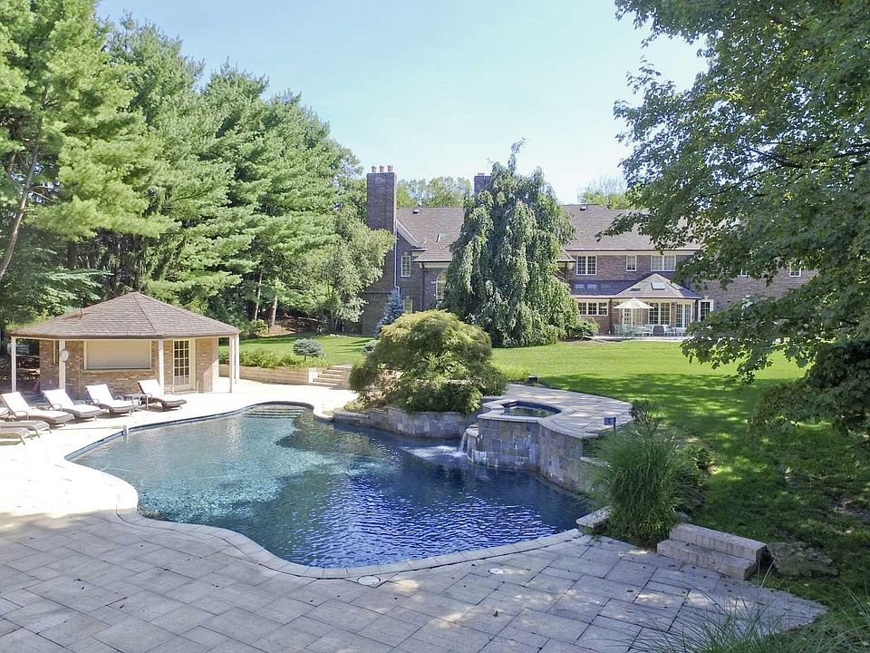 One of the most beautiful settings in all of Franklin Lakes, this oversized property is backed by a nature preserve offering complete privacy. The 11,000+sf. brick manor offers an open floor plan. The 2-story entry hall has a double bridal staircase and opens to both a banquet dining room and formal living room with a music alcove. The 2-story great room with fireplace and bar area is ideal for large scale entertaining. The woodworked office/library includes a fpl and is well situated for working remotely. The very generously proportioned kitchen has a large island & breakfast area. There is a bedroom and bath on the 1st floor & the primary bedroom suite + 5 additional bedrooms on the 2nd floor. The finished lower level has a recreation area, theater area, gym/bth, kitchen area, office & powder room. There is an attached 4-car garage and a separate 2-car garage. The resort setting includes a pool with waterfalls & spa, cabana, and large patio areas.