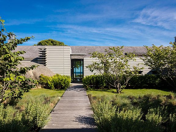 LUXURY PROPERTY AUCTION: BID 11-24 APRIL. Listed for $14M. Starting Bids Expected Between $4M-$7M.Perched high on a hill, this Martha's Vineyard estate offers unparalleled privacy and commanding views of the Atlantic Ocean and Chilmark Pond. Designed by renowned architect Rick Sundberg and crafted by master builder Andrew Flake, this three-parcel residence harmoniously blends contemporary amenities with classic Vineyard aesthetics. Upon entering, tall ceilings and oak flooring bathe the interiors in natural light, while expansive glass walls frame panoramic ocean vistas. The modern kitchen boasts cherry cabinets, granite countertops, and premium appliances from Sub-Zero, Miele, Wolf, and Scotsman. The primary suite serves as a luxurious retreat, featuring a private study with fireplace, two opulent baths, a deck, and heated floors throughout. A heated infinity pool offers elegant terrace views of the ocean, complemented by a large kitchen garden, fruit trees, and a half-basketball court. A detached three-bay garage and a two-bedroom guest cottage provide ample space for visitors. Private south shore beach rights, accessible by boat from Chilmark Pond, complete this offering.