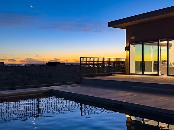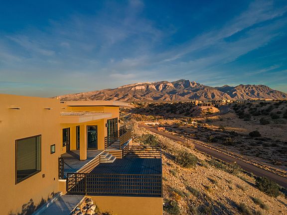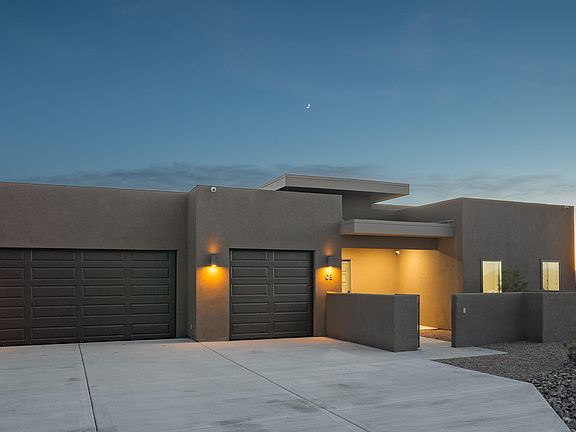 Absolutely stunner! Single story, 3-year young contemporary custom with pool overlooking the Sandia Mountains & city lights. All bedrooms feature en-suite baths w/roll-in showers. Primary bedroom w/built in breakfast bar/cabinets; patio access & luxurious bath w/soaker tub & shower plumbed for steamer. Gourmet kitchen w/Dacor double oven/range/hood refrigerator & Wolf microwave & espresso machine, stainless farm sink, vast bar seating & wood/metal island. Opulent dining room for entertaining. Living room features walls of windows & oversized sliders that brings the outdoors inside, remote control blackout blinds, home theater system plus flat screen TV. Heated & cooled 3-car garage w/TV hookups & new epoxy coating. Close-in Placitas location w/quick I-25 access. Welcome home!