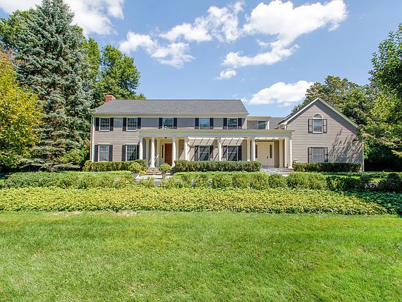 Elegance and prestige distinguish this traditional colonial home and grounds on sought-after street close to town and schools. Majestic U-shaped drive, columned porch, pergola & stately main entry. Foyer w/French doors lead to living room w/marble-top fireplace & dining room. Large windows throughout illuminate interior and showcase manicured, private 2-acre, level property. Family room w/stone fireplace, skylights & picture window look onto open backyard large enough for pool & tennis court. Beautiful cabinetry, tile, marble counter tops & stone floors appoint the kitchen. Five spacious bedrooms. Five top-quality baths, each with window. Second entry, back stairs, mud room. Attached, heated 3-car garage w/built in hybrid car charger. Top-of-line generator can run entire home for 2 weeks. Brick & stone terrace w/ built-in grill. This exquisite home is waiting for you!