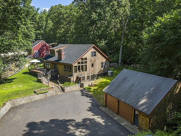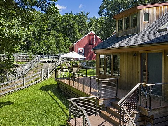 Classic New England setting for this contemporary cape and barn! Sited off scenic Sawyer Hill Road, among fields and stone walls, you will feel like you're in Vermont yet only minutes from major routes and shopping! The house features lots of glass, soaring ceilings, and wood floors with a living room, bathed in sunlight, and a wood stove. Kitchen is updated with cherry cabinets, double ovens, granite counters, built in china cabinet and dining area which leads to a Wrap around deck that brings the outside, in. First floor main bedroom offers ensuite bath, office with built-in shelves, and a laundry with half bath. Attached screened porch and oversized 2 car, heated garage. Upstairs contains two bedrooms and bath with a steam shower. The barn has 3 stalls and a tack/grain room and full loft. Horses come and go from the barn to the pastures, one with a run-in shed. A large riding ring and a spectacular "goat tree house" is included with two rooms and rocks to climb on! Bucolic setting!